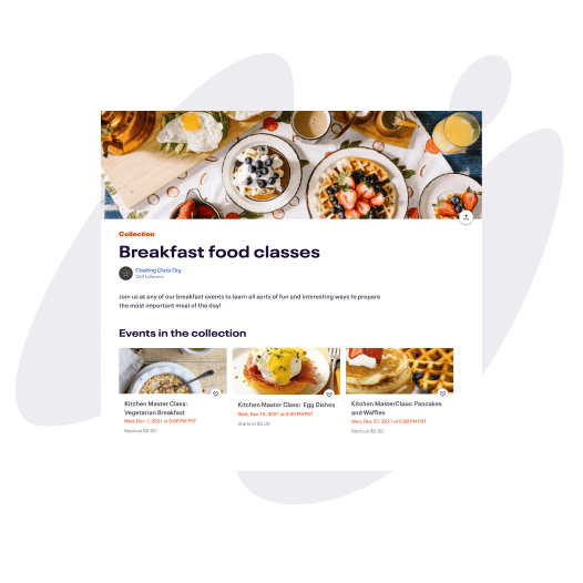 Group your related events onto individual collection pages to make it easier for attendees to find what they’re looking for — and make their online ticket purchase seamless.