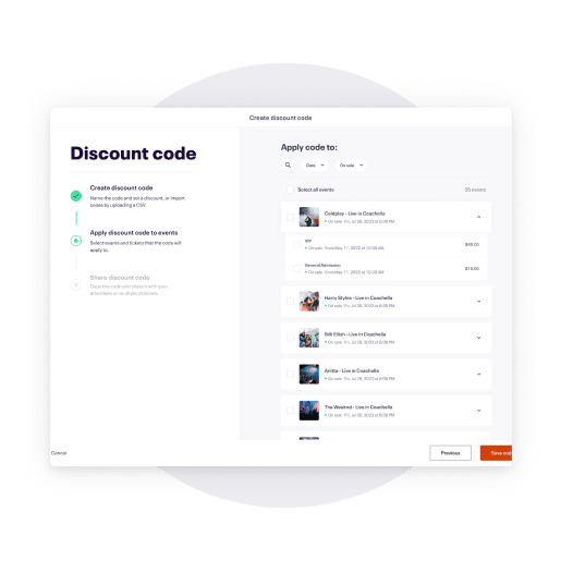 If you're wondering how to sell tickets online at a higher volume, discount codes are a great way to incentivize a purchase. Utilize Eventbrite’s online ticket management software to create tickets, offer discounts for attendees, use promo codes to track the performance of your digital advertising campaign, or list an item with trackable promo codes for specific customer groups — to discover who is spreading the word about your event.